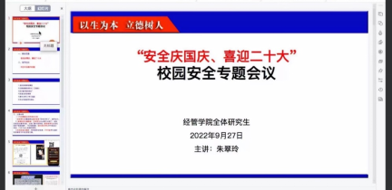 (通讯员:吴彬)9月27日,经济与管理学院全体研究生开展了“安全庆国庆、喜迎二十大”校园安全专题会议,研一及研二研三分别由辅导员黄承石、朱翠玲主讲。