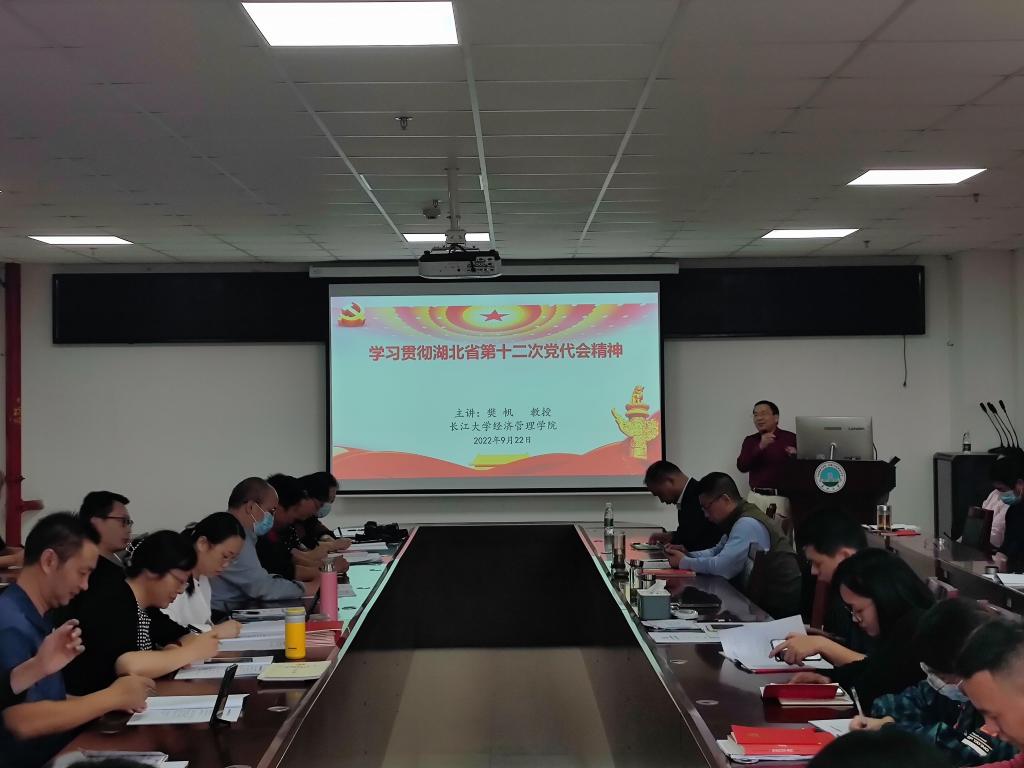 樊帆以《学习贯彻湖北省第十二次党代会精神》为题,向全院党员老师宣讲了湖北省第十二次党代会的主要内容与工作部署。会上,与会党员老师还集体学习了《习近平谈治国理政》第四卷和习近平总书记考察湖北重要讲话精神等内容。