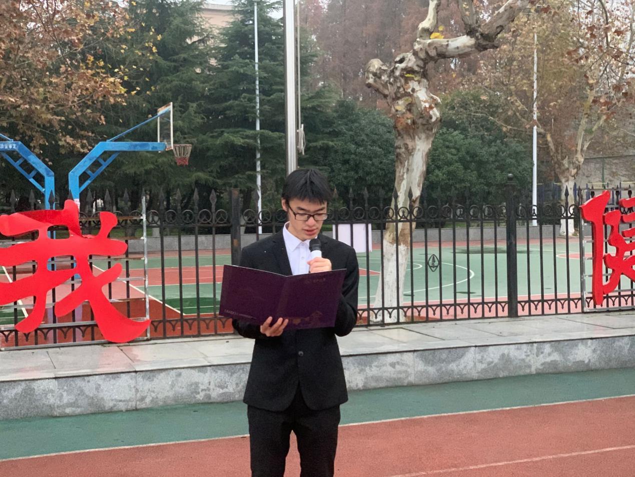 接下来,由团委学生会代表集体朗诵“春风又绿江南岸,华夏再沐朝阳,洪水图腾蛟龙,烈火涅槃凤凰……”字里行间中透露出青年学生的远大理想和蓬勃朝气。随后,农经11902班的学生代表尹东昊同学做了国旗下的讲话,他以2020年的新冠疫情作为大背景,针对 “如何充分利用我们的复习时间”、“怎样提升学习效率”、“如何调整心态”以及“如何加强考试时的自觉性”四个问题向同学们提出了建议。