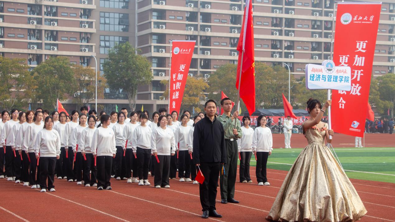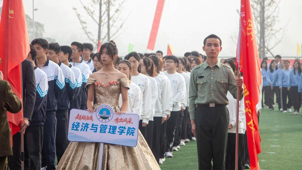 旌旗猎猎,步伐铿锵。开幕式上,经济与管理学院方阵以昂扬姿态惊艳亮相,响亮的口号与整齐的步伐,凝聚着全院师生的集体荣誉感,展现出经管人锐意进取的精神底色。