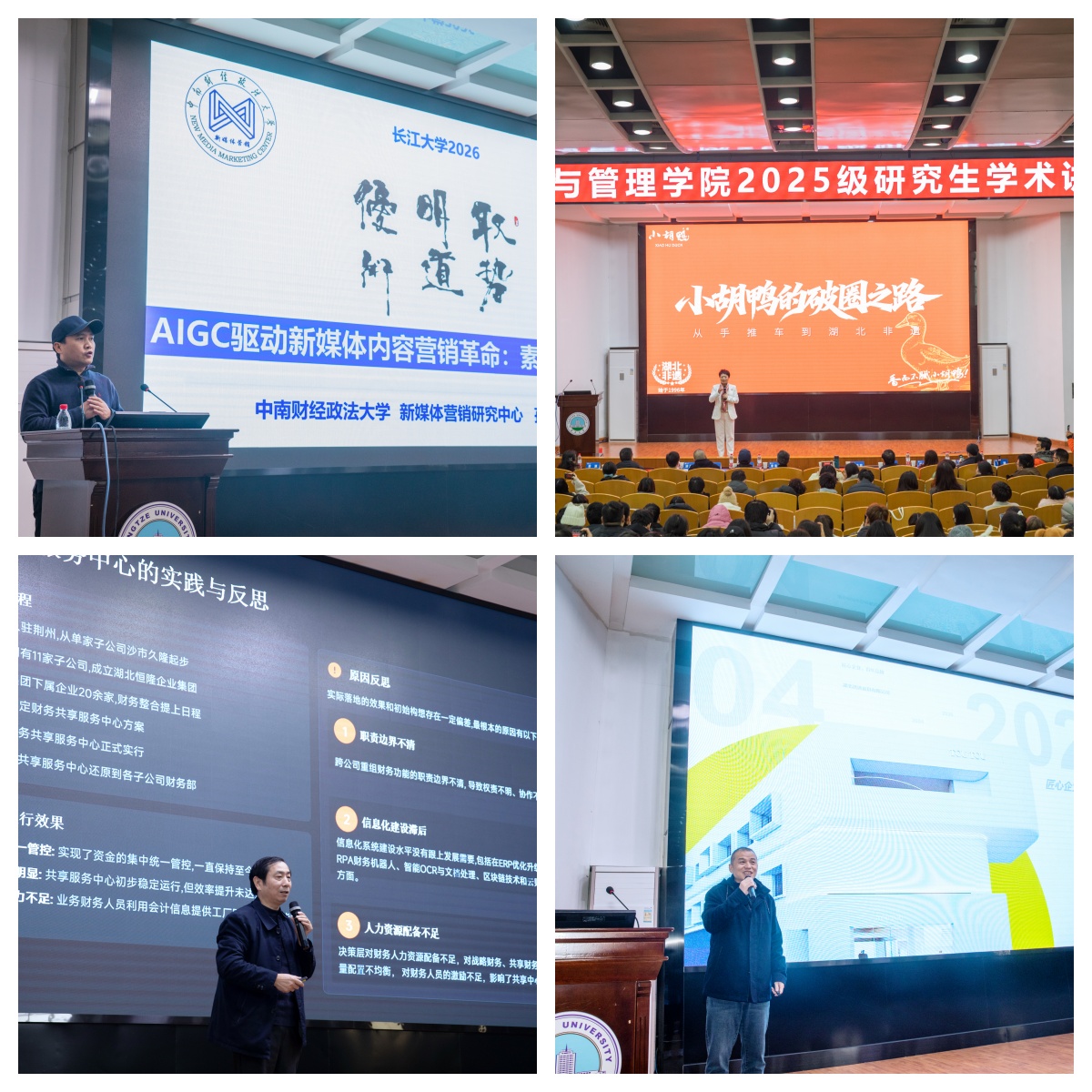随后,各位嘉宾结合自身研究与实战经验,奉献了一系列富有洞察的专题报告。孙洪庆副教授以“AIGC驱动下的新媒体营销:素人机会在哪?”为题,深入剖析了数字时代营销变革的前沿趋势;小胡鸭品牌联合创始人胡秀容以“从手推车到非遗——小胡鸭的破圈之路”为主题,生动诠释了传统企业在新时代的品牌焕新路径;恒隆集团财务总监姚传新围绕“深耕细作,不负韶华”,分享了财务专业人才的成长哲学与职业坚守;TOUTOU品牌创始人黄杰则以“初心是因,品牌是果”为核心理念,阐述了创业历程中的治理智慧与价值坚持。