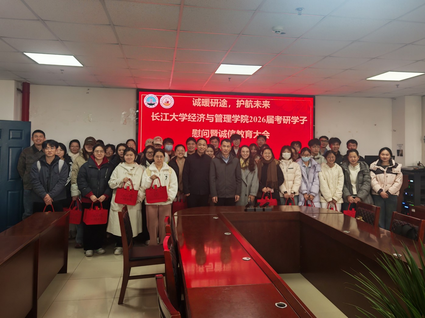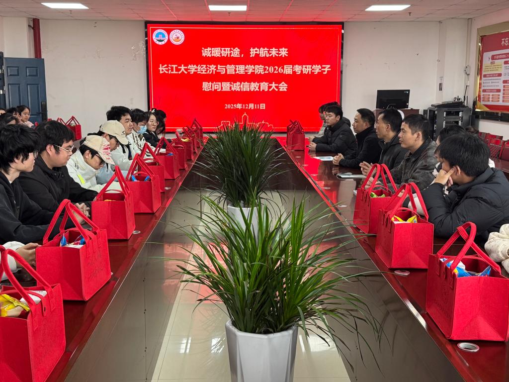 (通讯员 方含之)为鼓舞考研学子士气,坚定备考信心,12月11日上午,长江大学经济与管理学院为2026届备战研究生考试的同学们举办了一场温馨的慰问活动。经济与管理学院党委书记李喜成、副书记平先锋出席活动,为同学们加油鼓劲,2022级辅导员叶星、方含之、谭敏共同参会。