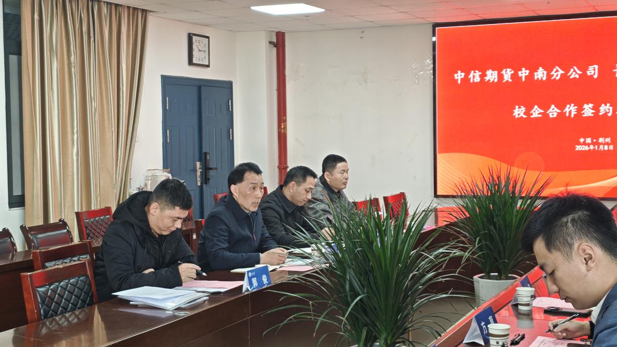(通讯员 欧阳佩文 / 文 严康 / 摄)为进一步深化教育教学改革,完善实践教学体系,拓宽毕业生高质量就业渠道,1 月 8 日上午,长江大学经济与管理学院与中信期货有限公司中南分公司(以下简称 “中信期货中南分公司”)在东校区文科楼505会议室隆重举行校企合作签约暨就业基地授牌仪式。长江大学经济与管理学院党委书记李喜成、党委副书记平先锋、学工办主任叶星、就业专干郭俊,中信期货中南分公司党支部书记兼总经理苏仲博、副总经理冯宇、党支部组织委员兼人力资源专岗方赢、渠道业务部资深业务总监陈厚烨,以及中信银行荆州分行行长万旌、零售分管行长徐娟、办公室主任杨露露等校企双方代表出席了本次活动。