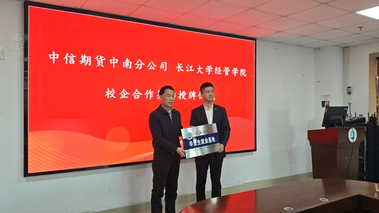 在全体与会嘉宾的共同见证下,校企双方代表正式签署《校企合作协议》。随后,学院向中信期货中南分公司授予 “长江大学毕业生就业基地” 牌匾,标志着双方合作迈入实质性、规范化发展的新阶段,为学院学子搭建了直达优质企业的就业桥梁,也为校企协同育人奠定了坚实基础。
