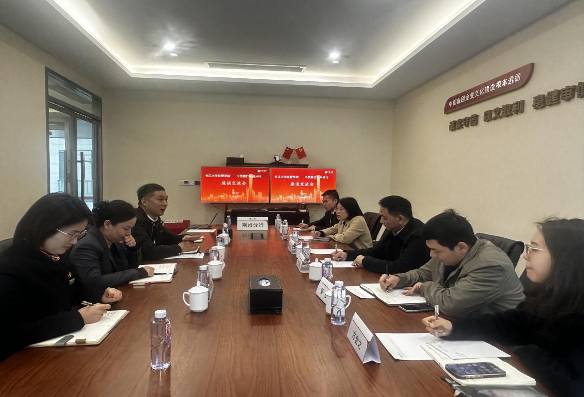 结束在荆州市城市发展控股集团有限公司的交流后,平先锋一行前往中信银行荆州分行,与分行万旌行长及相关部门负责人开展友好交流。万旌行长介绍了分行的发展历程、核心业务范围,重点说明了金融类经管人才在专业素养、实践能力等方面的具体要求,同时分享了分行在人才队伍建设、员工培养方面的宝贵经验。