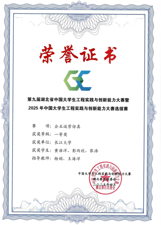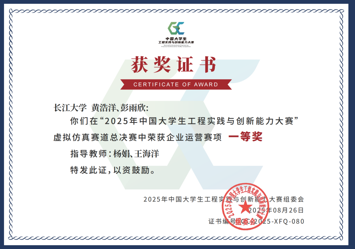 近日,2025年中国大学生工程实践与创新能力大赛全国总决赛圆满落幕。由我院杨娟、王海洋老师指导,卓12201班黄浩洋、会卓12301班彭雨欣组成的参赛团队,凭借出色的企业运营仿真能力与创新思维,一路过关斩将,最终荣获全国一等奖,展现了我院学子卓越的企业管理知识与跨学科综合能力,为学校赢得了崇高荣誉。
