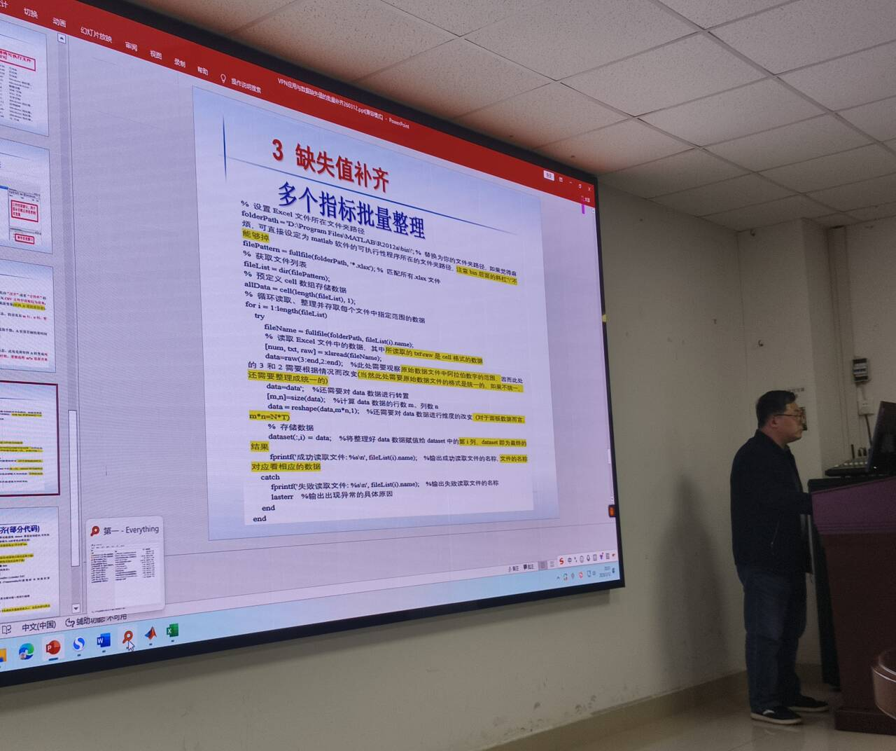 孔令成老师首先介绍了VPN的内涵及其在学术资源访问中的重要性,详细讲解了网页版VPN和软件版VPN的使用方法,并现场演示了如何通过学校图书馆数据库导航快速访问目标数据库。随后,他针对科研中常见的数据缺失问题,系统讲解了指标查找的途径,并介绍了Matlab软件的安装与破解过程。孔令成老师以“手把手”的方式,从软件分类、绿色软件的应用步骤到Matlab的安装与破解逐一进行演示,确保同学们能够顺利安装并使用。最后,他展示了如何利用Matlab进行单个指标和多个指标的缺失值批量补齐,并分享了相关核心代码,以帮助同学们实现数据处理的自动化、系统化与高效化。