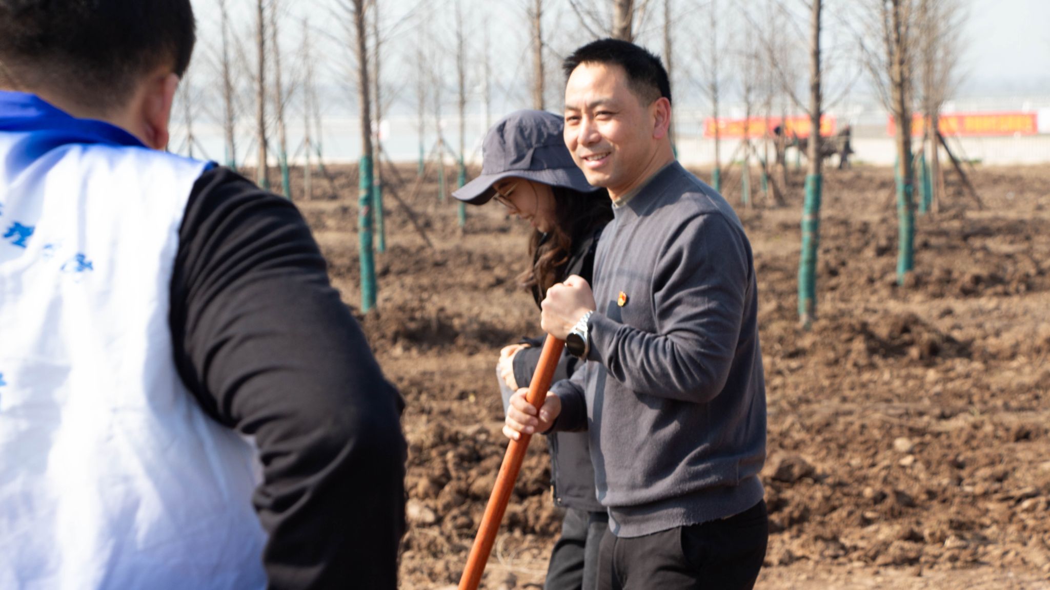 下午3时许,阳光和煦,尽管位于长江之滨的盐卡泵站附近泥土松软、地势起伏,但同志们热情高涨,迅速投入到劳动中。在场地技术人员的指导下,大家认真学习植树要领,党员们三两成组,分工协作,挥锹铲土、扶苗填坑。现场一派热火朝天的景象,青春的汗水与泥土的气息交织,新生的树苗在江风中昂然挺立。